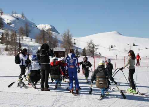 Sulle piste di Madonna di Campiglio con i ragazzi in carrozzina per un corso di avviamento o di perfezionamento alla pratica dello sci.